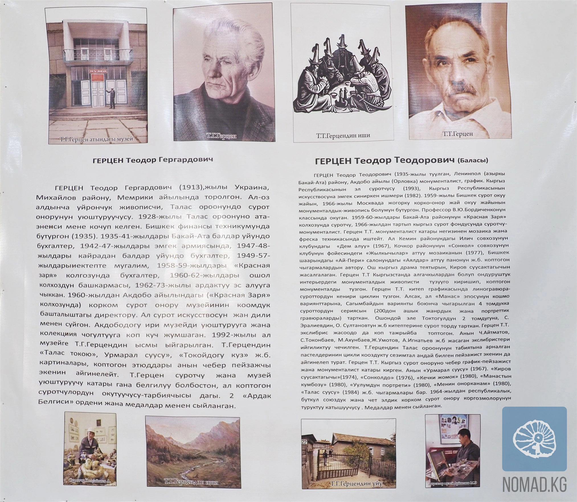 Сегодня музей - это три основных зала в здании, построенном в 1982 году. В одном зале-репродукции с картин(линогравюра) по эпосу «Манас» и археолого-краеведческие предметы. В другом -работы семьи Герцена, камерные, личные, честные. В третьем -произведения известных художников Таласской области, Кыргызстана и других республик бывшего СССР. Здесь легко поймать себя на том, что ты смотришь не только на картины, но и на следы жизни вокруг: как местные школьники заходят после уроков, как пожилые люди узнают знакомые лица на полотнах, как музей остаётся частью повседневности.