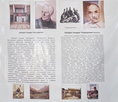 Этот музей носит имя отца знаменитого кыргызского художника Теодора Теодоровича Герцена - Теодора Гергардовича Герцена, образованного человека, собирателя книг по искусству, картин, репродукций с полотен мастеров, преподавателя рисования и черчения в школе. Детство художника пришлось на тяжелые военные годы.